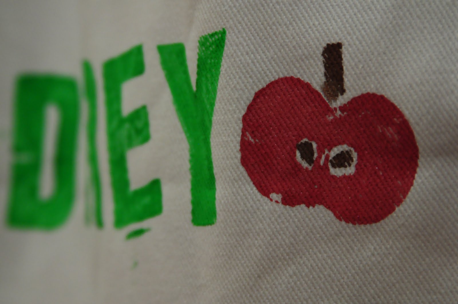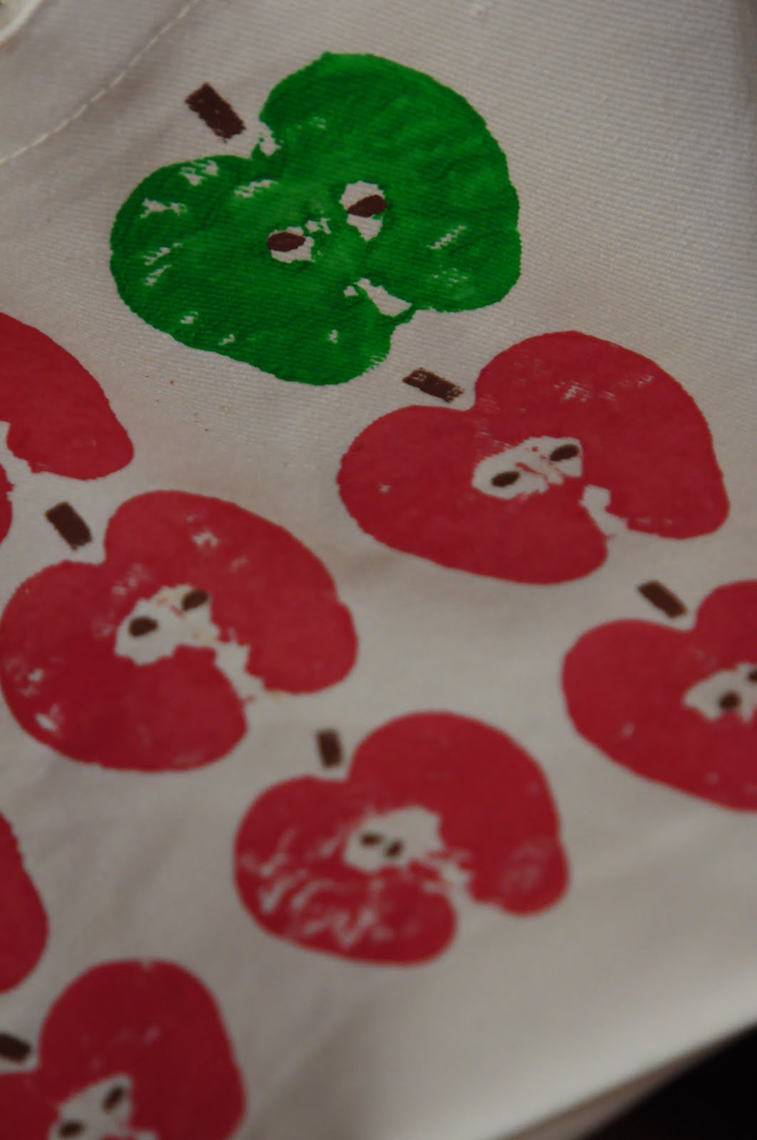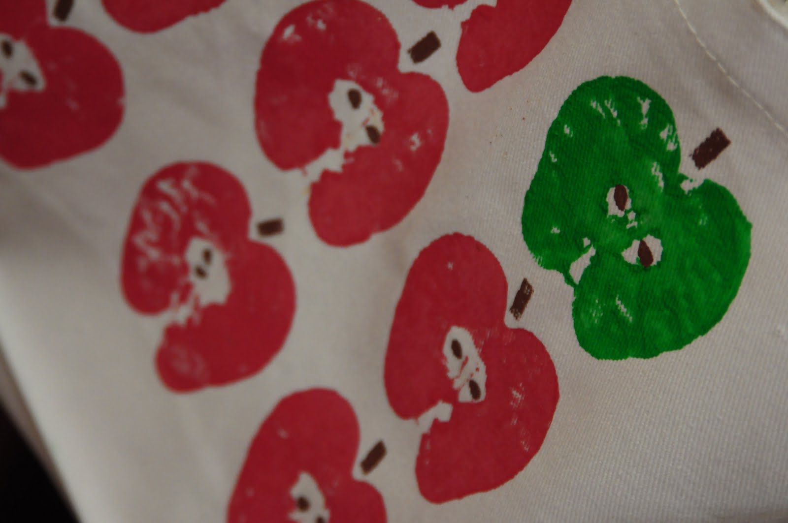 Step 1: Iron out your bag and place piece of paper inside so paint doesn’t bleed through. Cut your Washington fancy apple in half. Take into consideration where you are cutting because you want to see all apple’s curves. Put your paint on the plate and dip your apple on the plate. You might have to spread the paint around with a paintbrush.