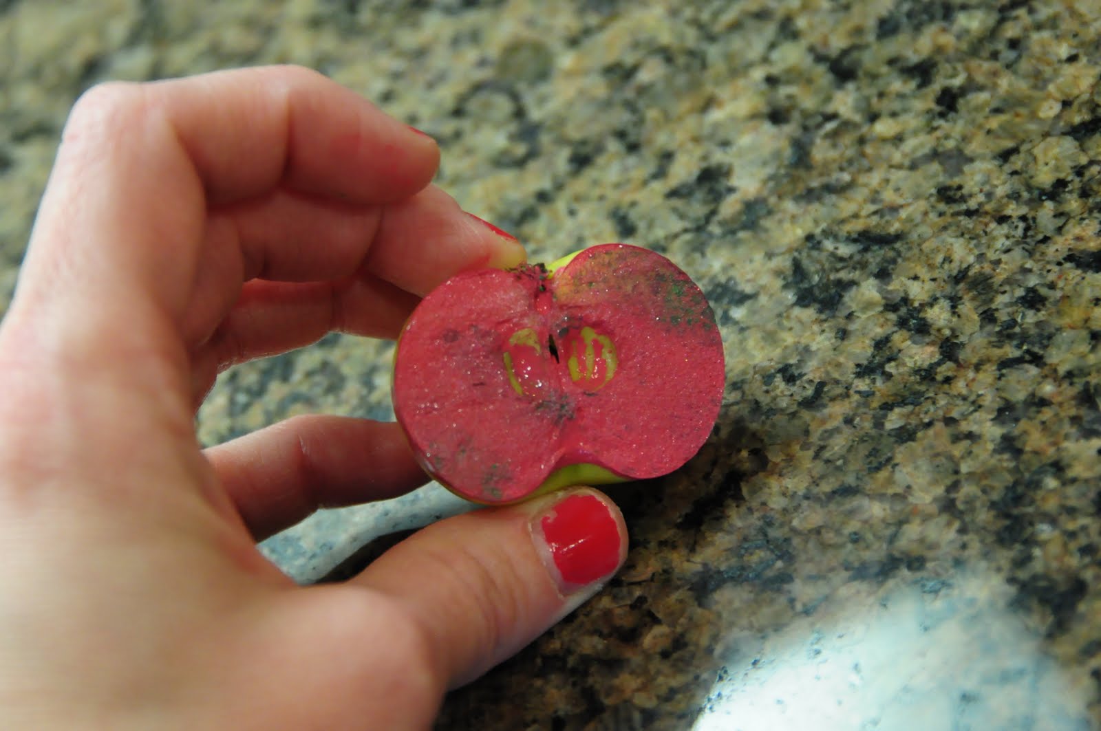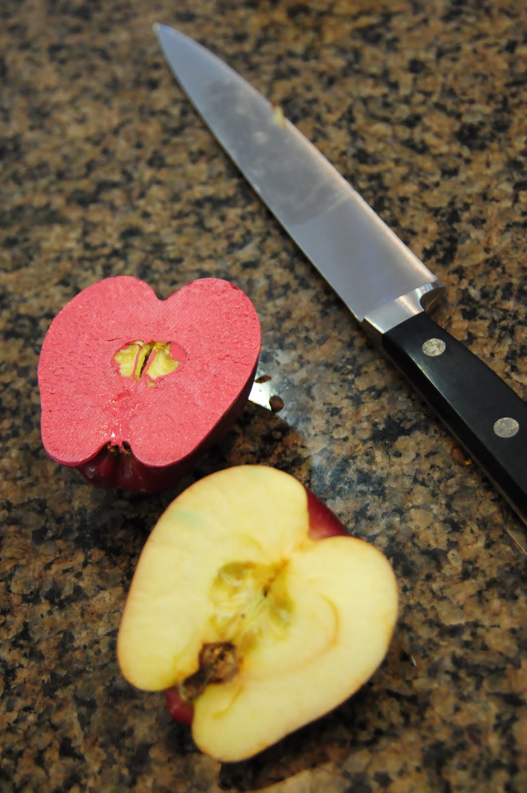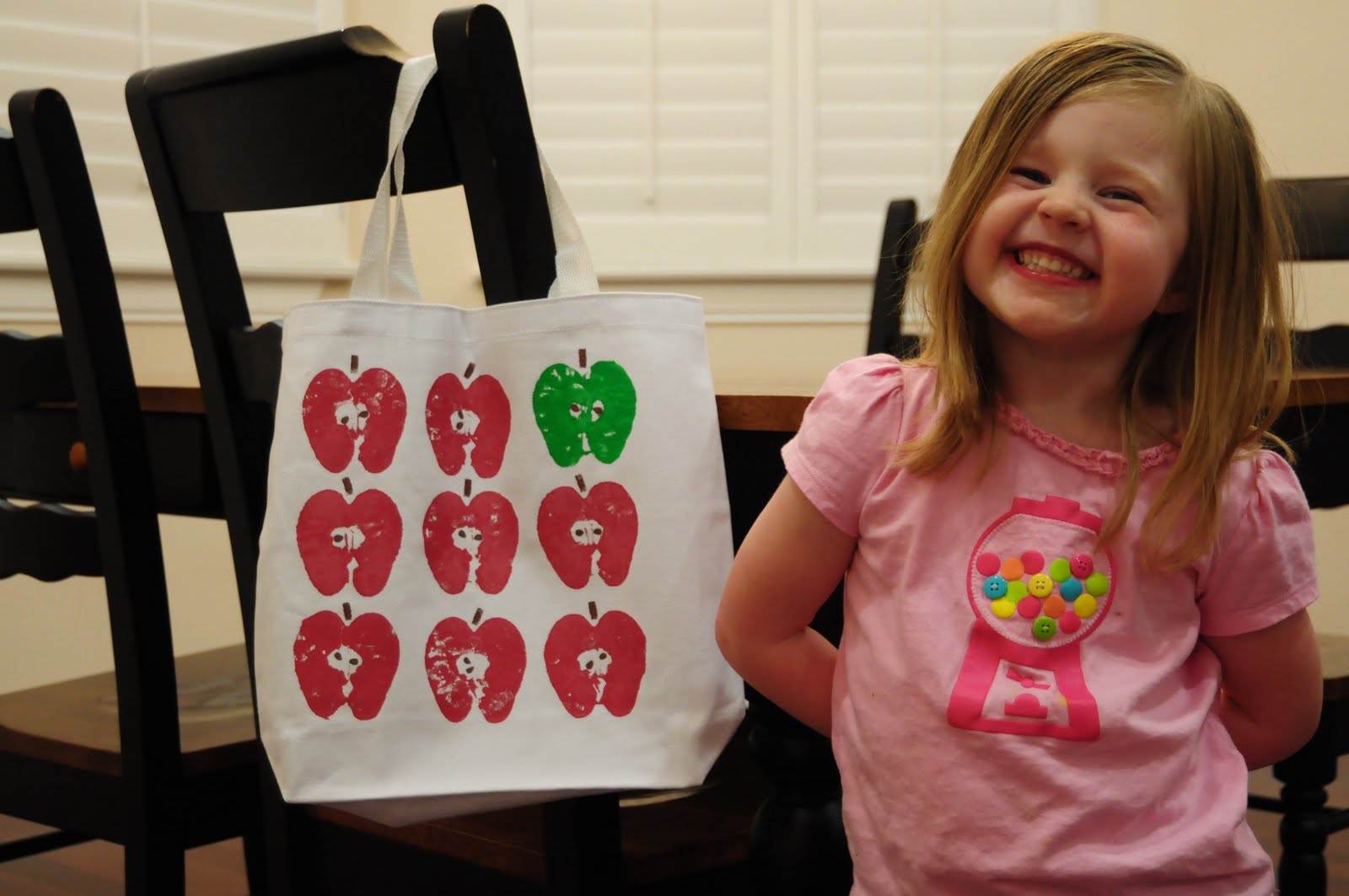 Step 1: Iron out your bag and place piece of paper inside so paint doesn’t bleed through. Cut your Washington fancy apple in half. Take into consideration where you are cutting because you want to see all apple’s curves. Put your paint on the plate and dip your apple on the plate. You might have to spread the paint around with a paintbrush.