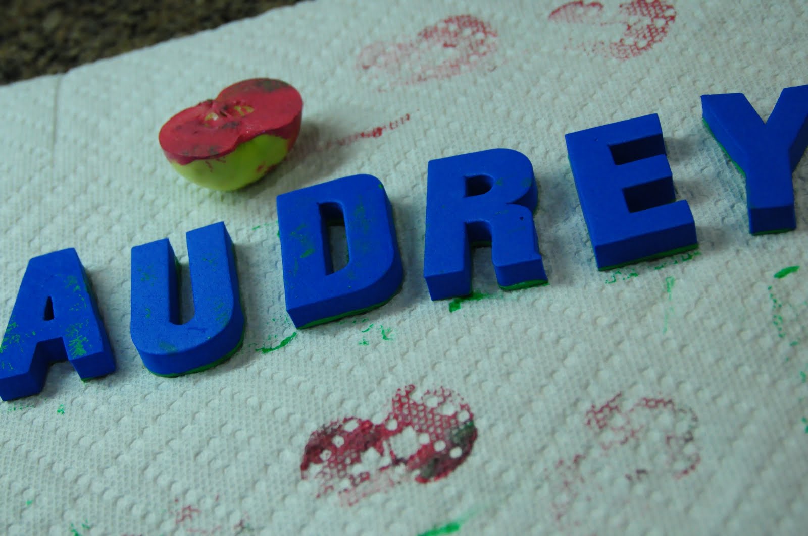 Step 3: This is optional. If you want to personalize your bag…take your foam letters and your mini apple. Cut your mini apple in half, set aside. Stamp a word of your choice and then take your crab apple and stamp in on the end. It just makes a cute mark. Fill in your stems and seeds like you did for your front.