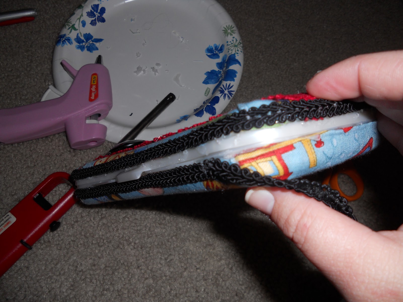 9) Glue the ribbon onto the edges of the front and back. Start at the back of the case and work your way around. When you get to the end overlap the ribbon about 1/2 inch. Again, go slow and only glue a small section at a time. Make sure to treat the ends of your ribbon.