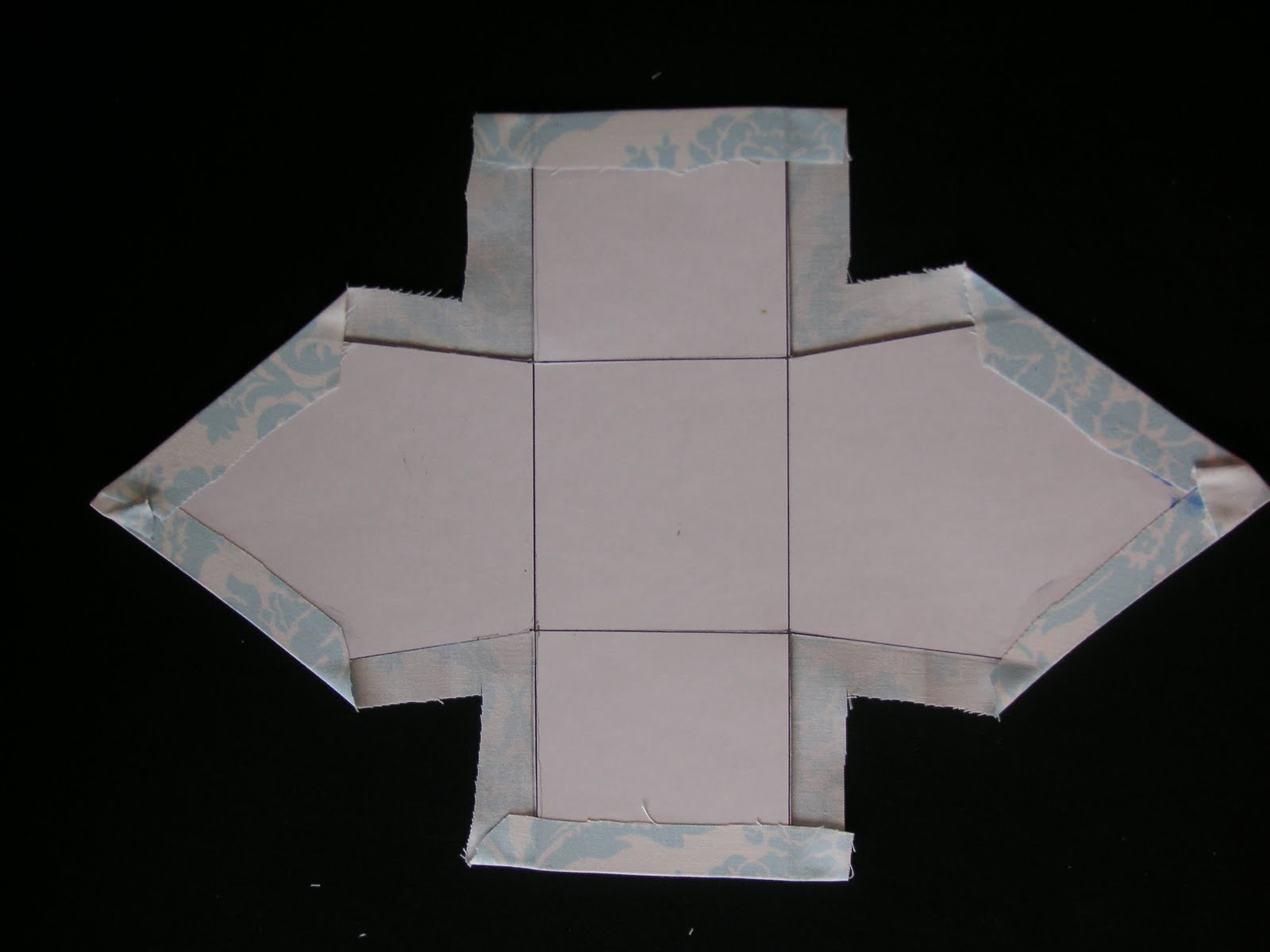 laying the cardboard cutout flat against the fabric I glued down the top of the eaves and the walls, I left the sides open since I would be sewing them together anyway. I scored the floor (square you can see in the middle of my cardboard cutout above) lightly with some scissors so they would bend along the fold more easily.
