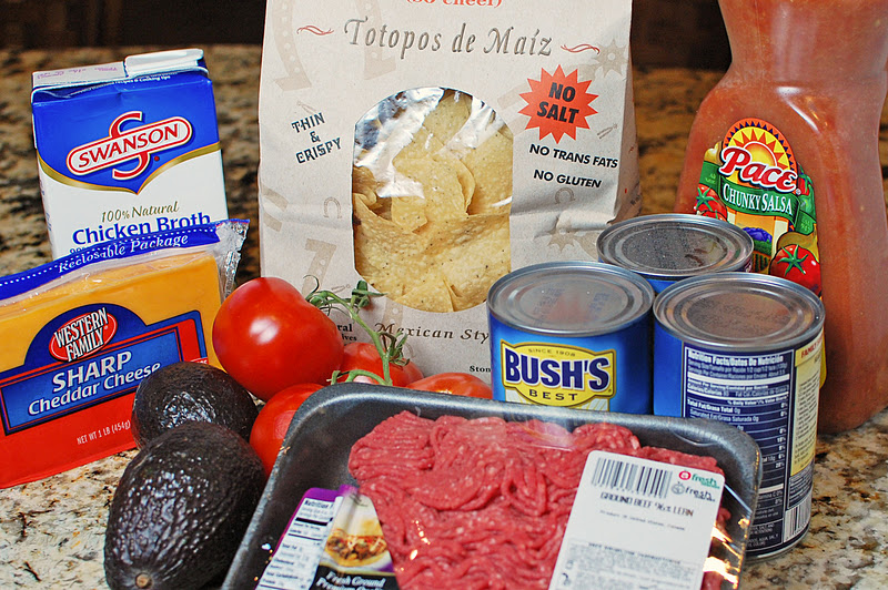 Alright, so this is what I used: 4 cans black beans, 2 cups chicken broth, 1 can corn, 1 cup salsa, and a pound of ground beef. You can easily substitute the ground beef for chicken, or even do it meatless. I love to add avocado, tomato, olives, cheese, sour cream, and crushed tortilla chips to the soup. Mmmm!