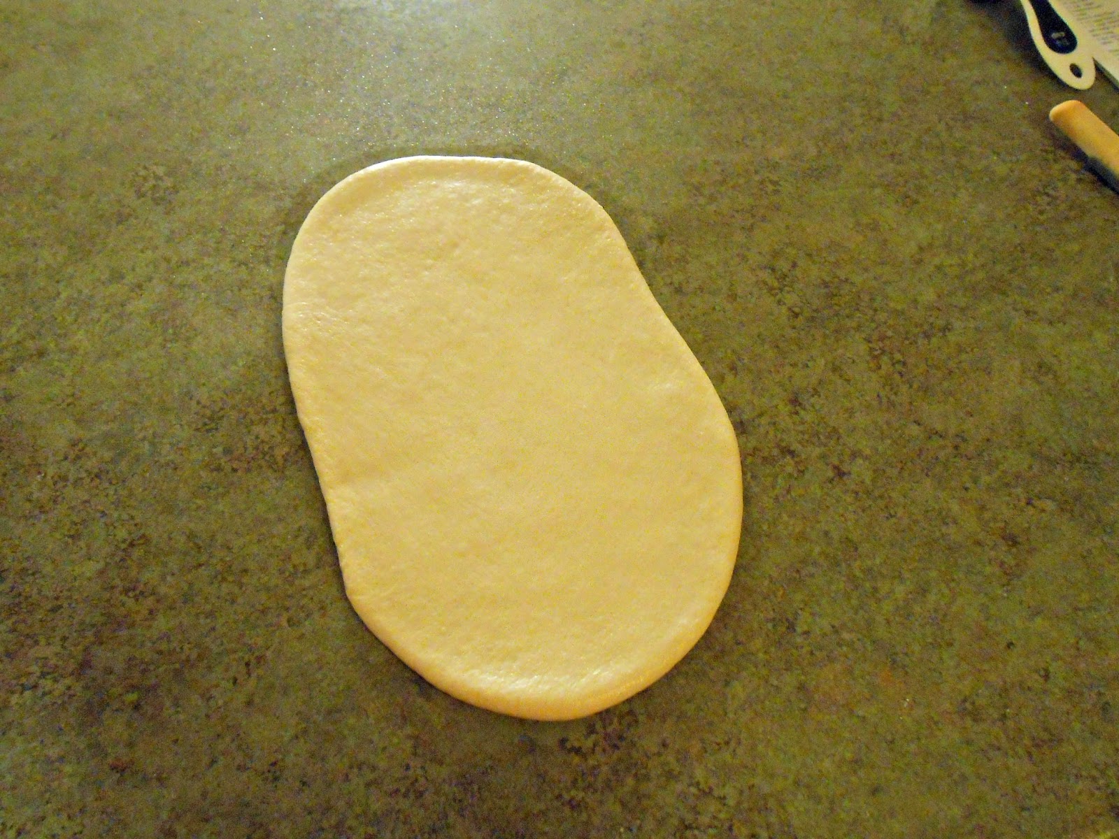 Punch down the dough and divide into 3 equal parts. Roll each part into a rectangle about 15 inches by 6 inches and about 1/4 inch thick or so.