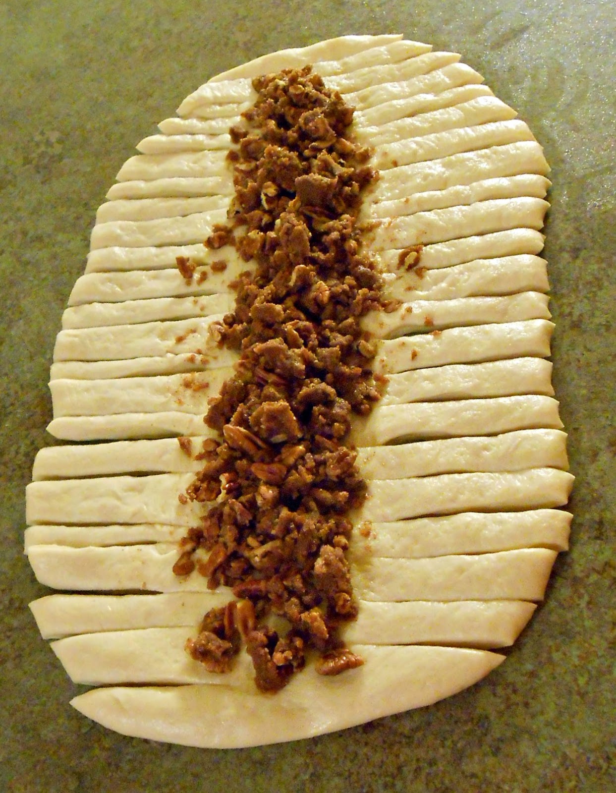 Spread 1/3 of the streusel mix down the center of the rectangle. Using a pizza cutter, cut slits down each side of dough. Try to make equal slits on each side or you’ll come out lopsided.