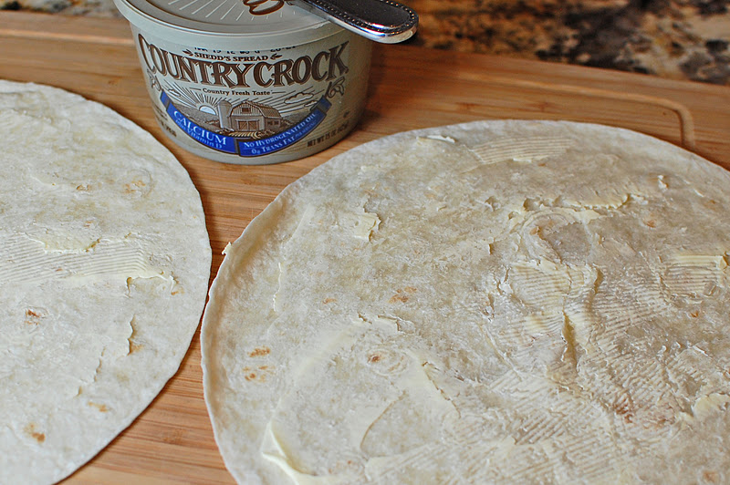 Butter one side of two tortilllas. Place the tortilla, butter side down, onto a hot pan.