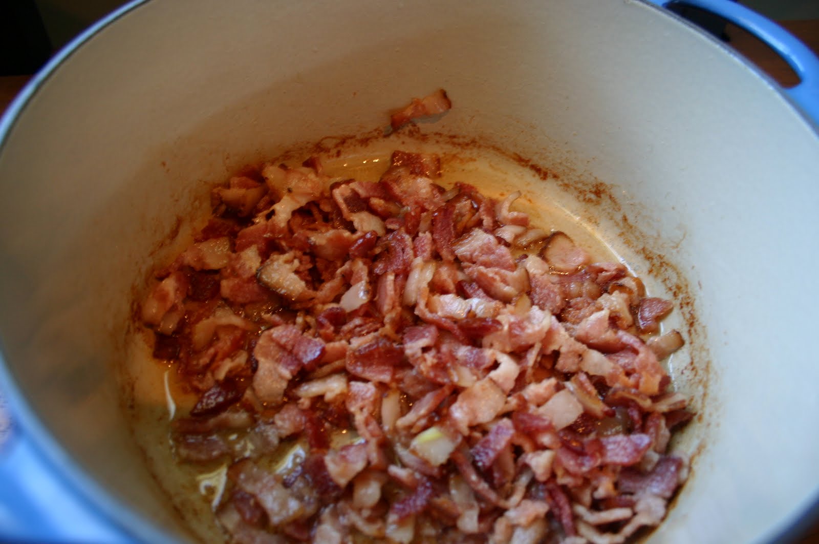 Next, cut up the bacon, and brown it. Remove the bacon and some of the grease. Leave a little of the grease to saute the leeks in.