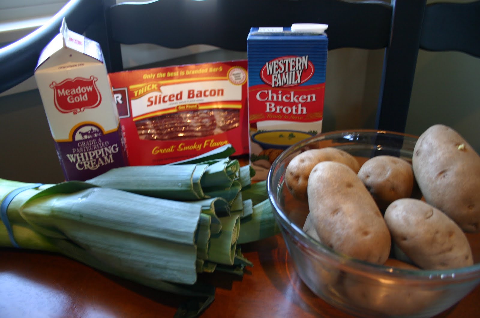 Your ingredients: Leeks, potatoes, chicken broth, whipping cream and bacon.