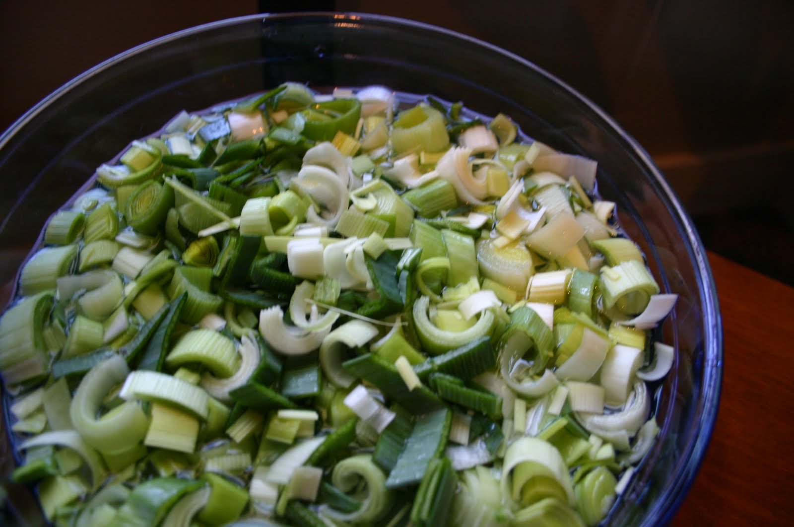 First, cut the leeks in half down the middle and chop up. Put them in a bowl of cold water to get the sand and grit out.