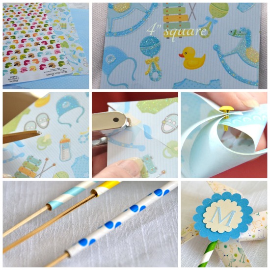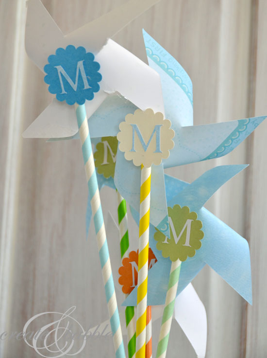 When my sister asked me to make table centerpieces for the guest tables, my first thought was flowers. But that’s not very original and I knew it wasn’t what she had in mind. She wanted me to create something. Something unique and fun. I put on my thinking cap and thought pinwheels! They can be colorful, fun, personalized and perfect for a baby boy shower! Now I’m sure I’m not the first person to decorate with pinwheels, but this is how I made mine. I did use my Silhouette Cameo using one of their pinwheel shapes, but these can easily be made without one. I’ll show you how.