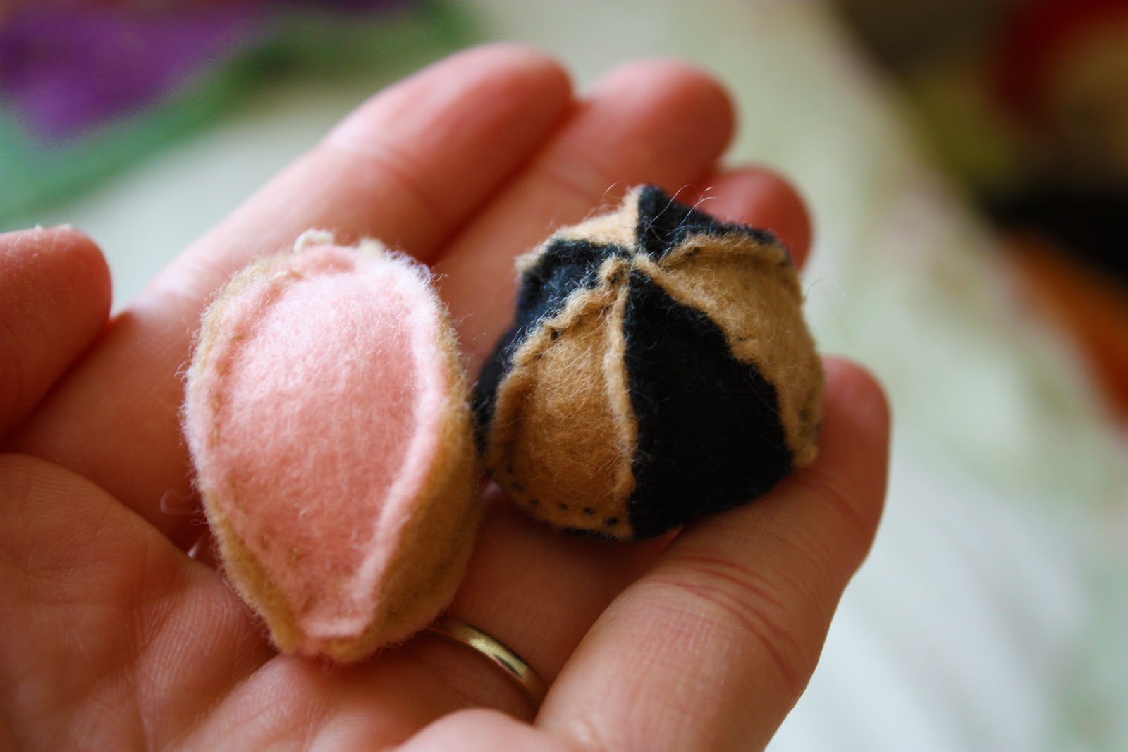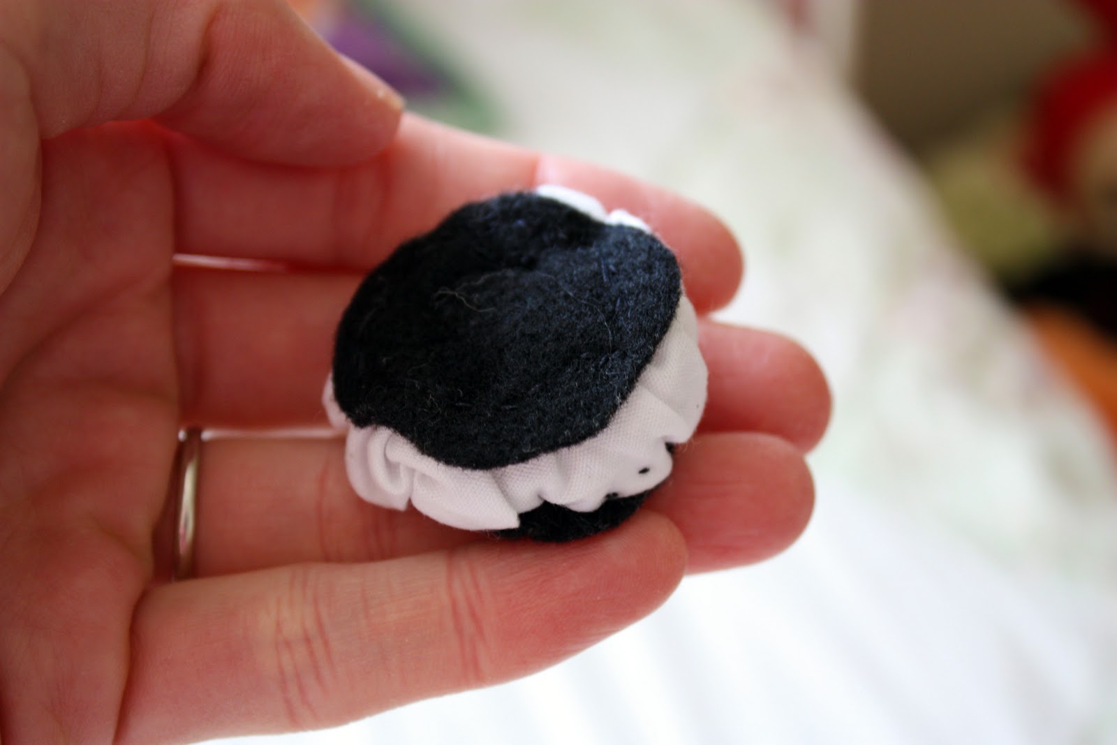:: For the chocolate pictured above, cut two circles out of yellow felt, one for the base one for the top. Then cut out of rectangle of black felt and stitch the ends together so it looks like a loop. Cinch one end tight with thread. Stuff. Stitch on base. Attach top with a couple stitches and pull lightly to make it look like a dollop of frosting.