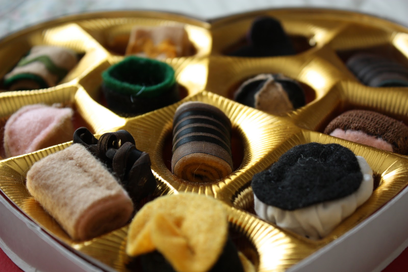 Here’s our everlasting box of chocolates. Hand-sewn with felt scraps and ribbons, I whipped these beauties out one afternoon two years ago. They’ve been eaten again and again. And they’re still going strong.
