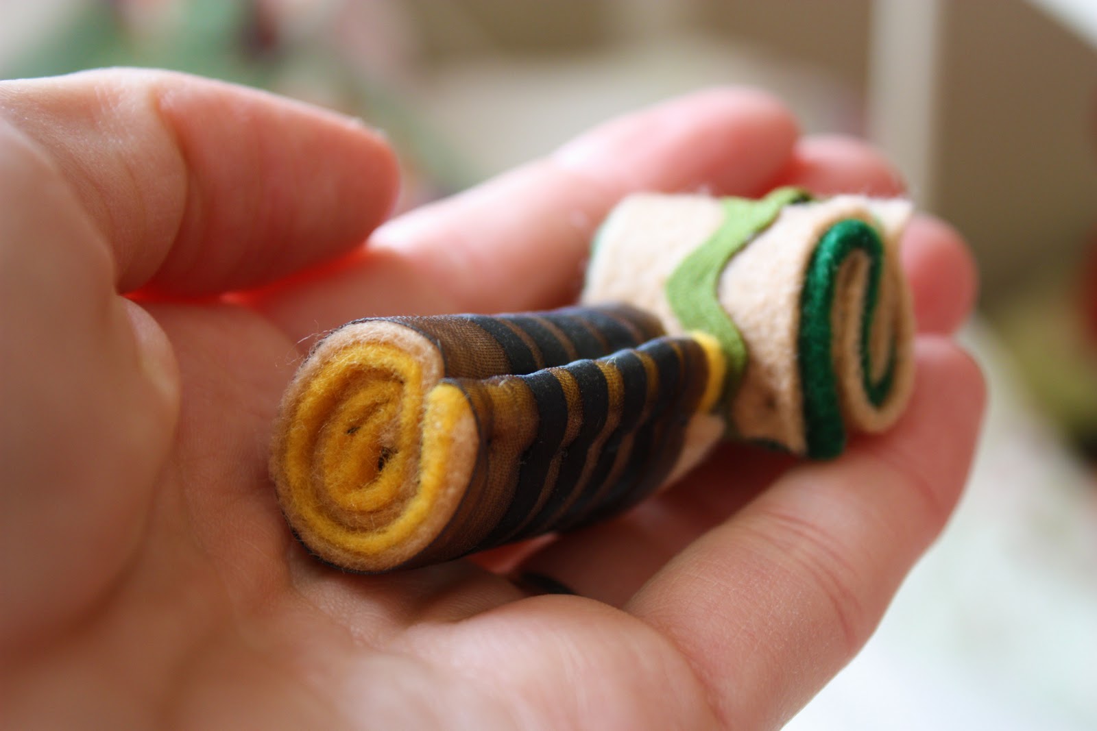 :: For these yummies, layer ribbons, ric rac, and rectangles of felt and roll or fold up. Stitch closed.