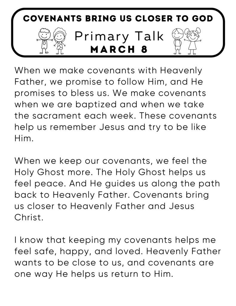 March 8 Primary Talk: Covenants Bring Us Closer To God