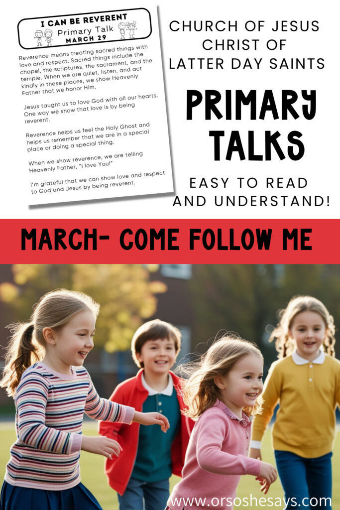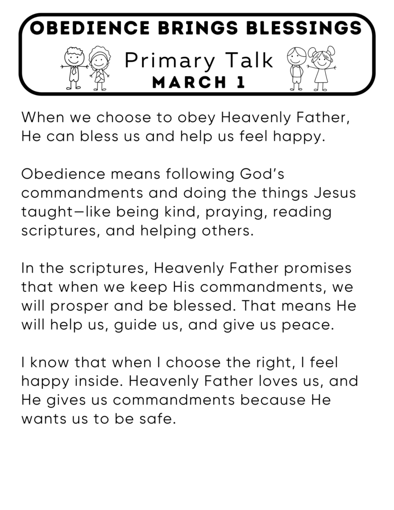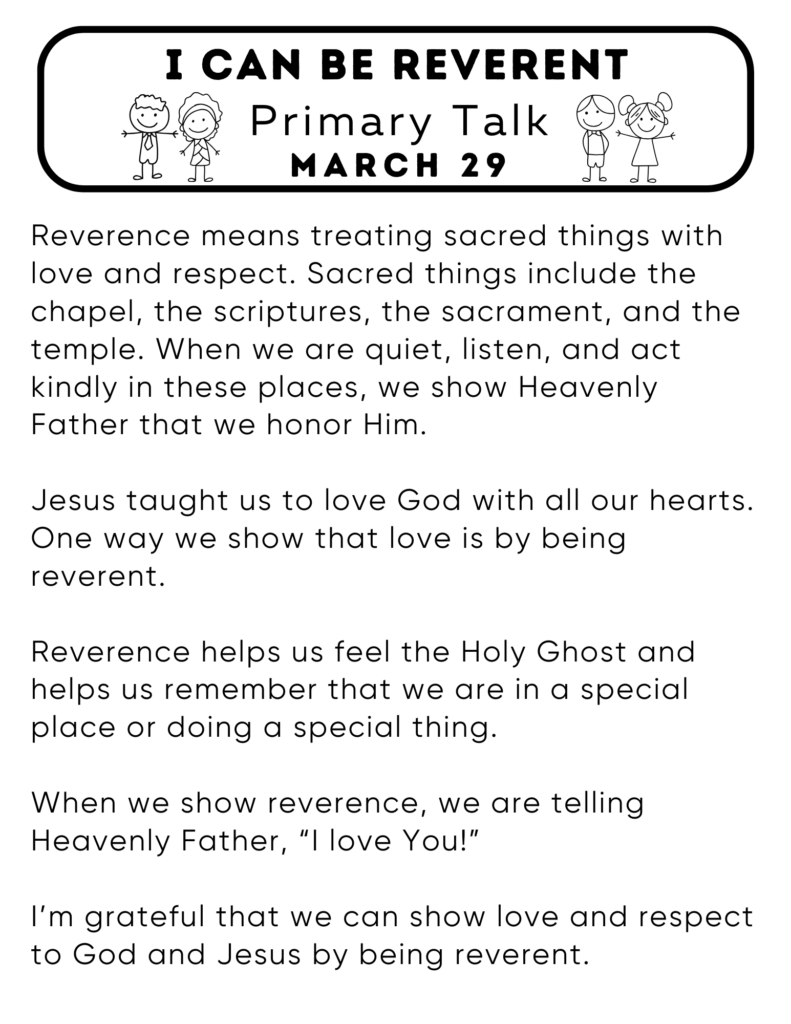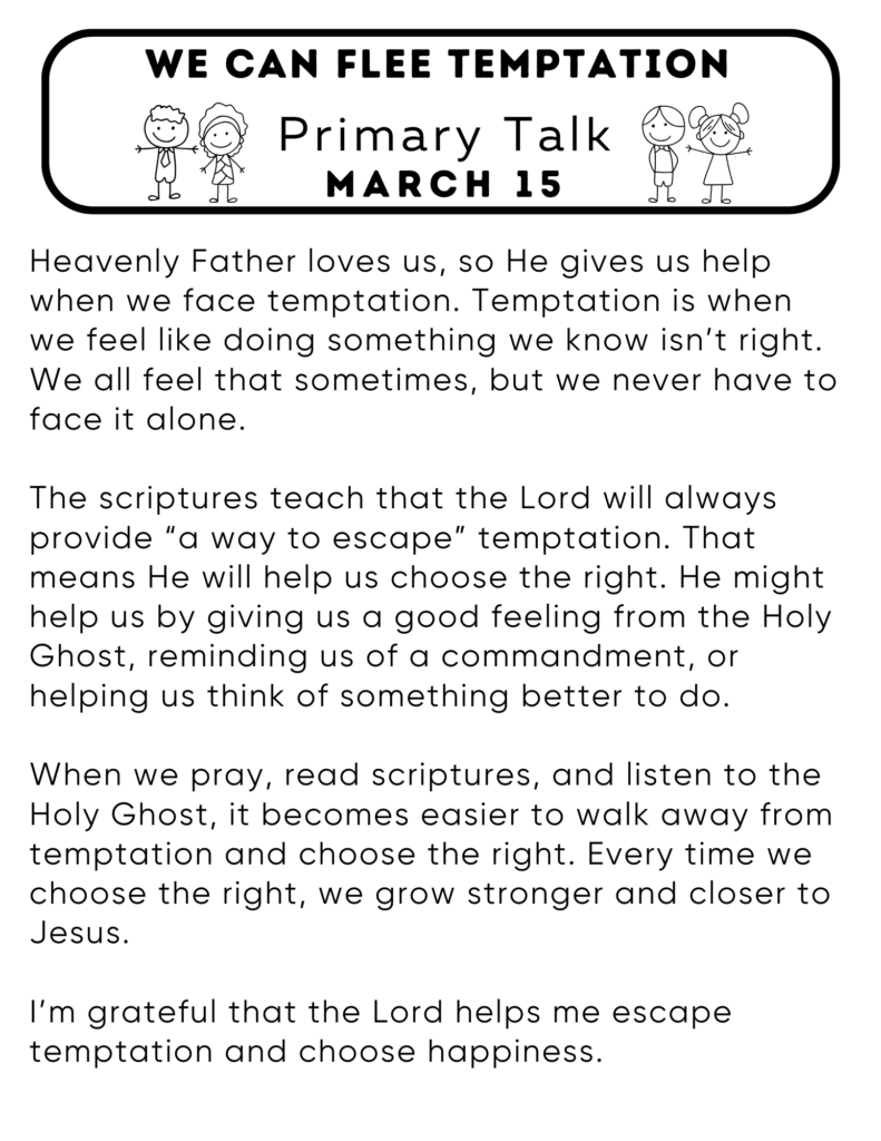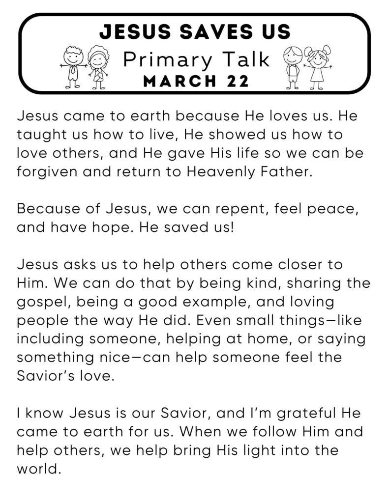 If you are a Primary Leader and would like to download and print all five of the March Come Follow Me Primary Talks you can use this link!