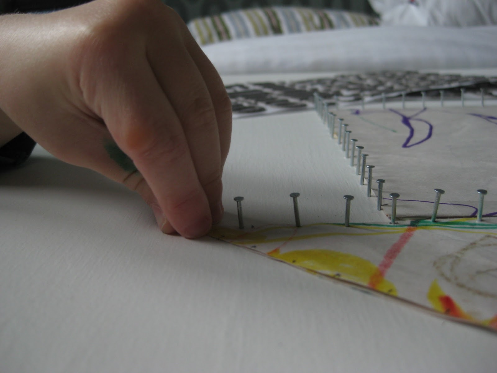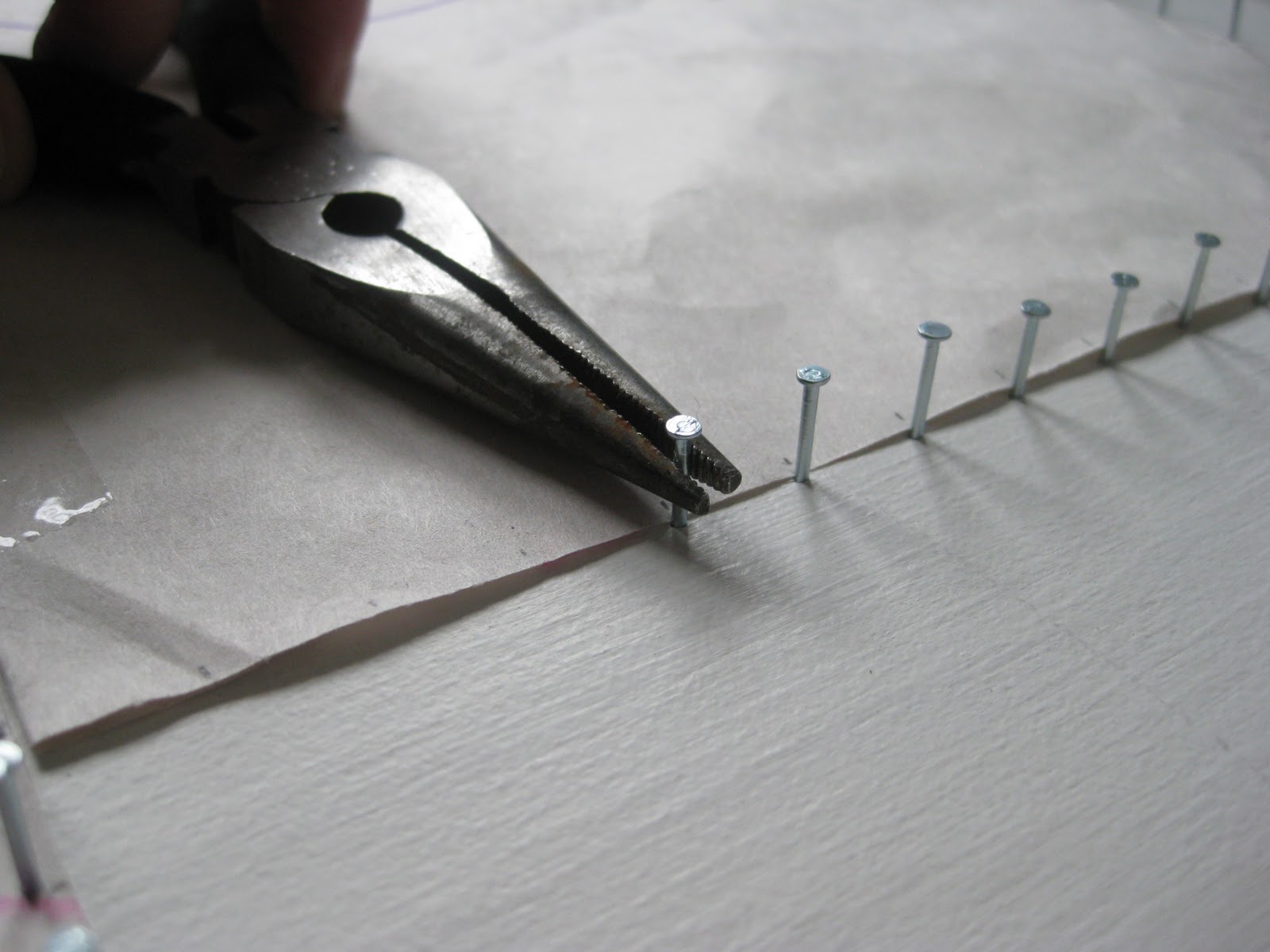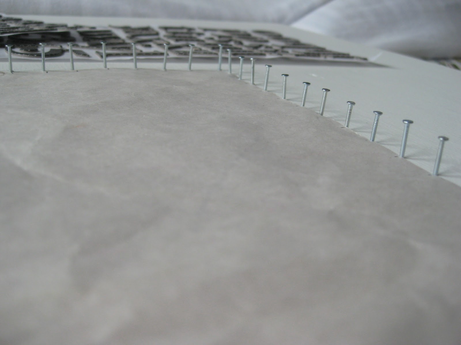 Start hammering in the little nails all around the edge. I took the cue from Nelly and measured out little tick marks on the paper so the nails were (fairly) evenly spaced.