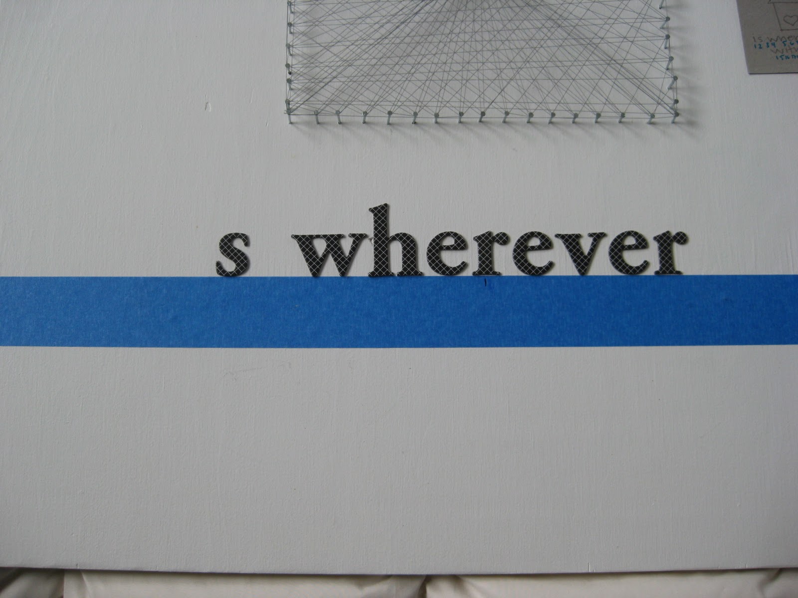 Once you are done winding the thread around in one direction, tie triple knots at ending point and at random spots wind the thread around the head of the nail a few times to secure it. Then move on to another direction. Once you are satisfied with the design, tie it off. When you’re done with the thread part, move on to your lettering. Use painter’s tape to align your letters and mark the center.
