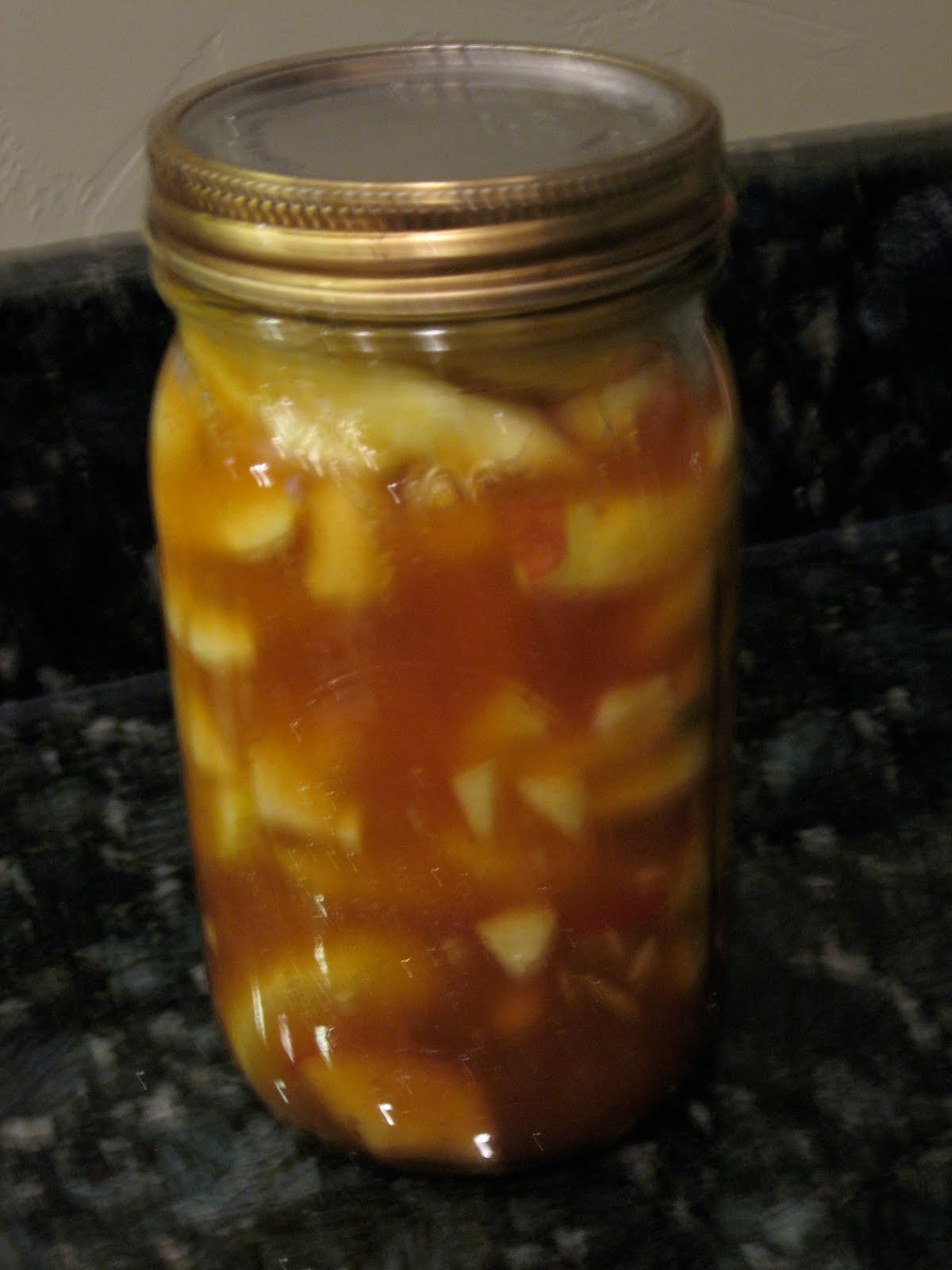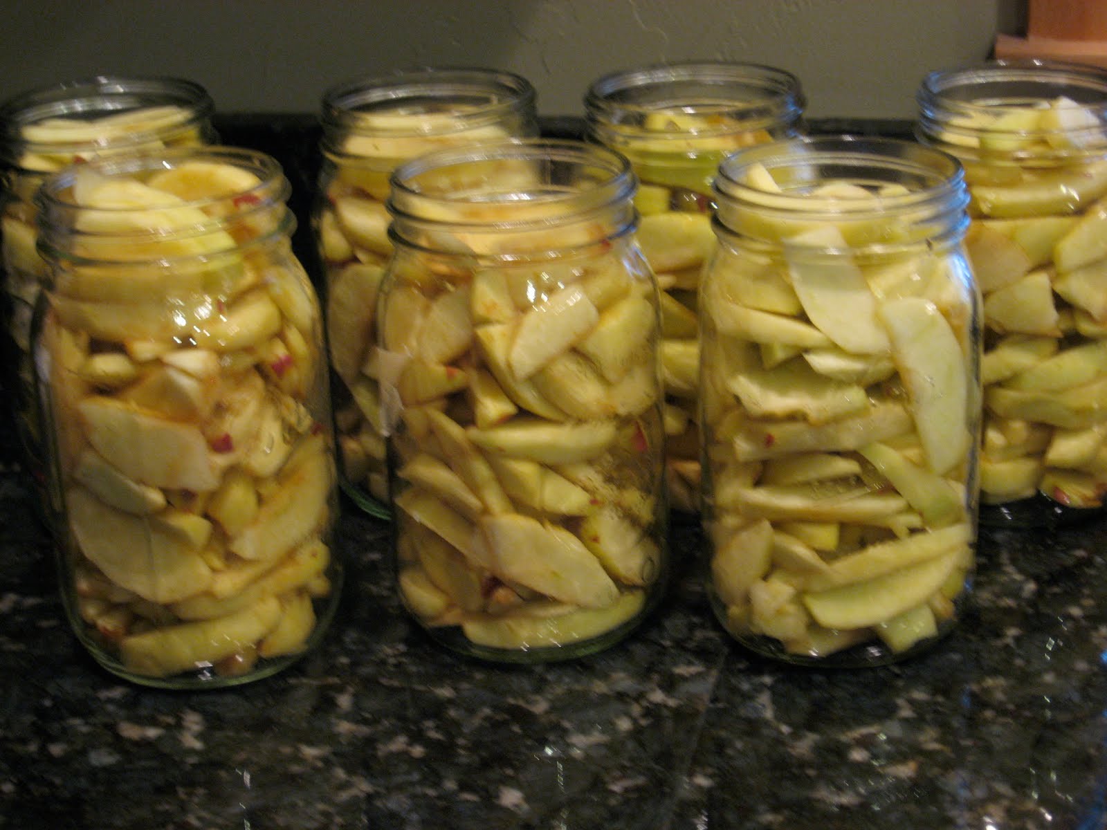 Pour about 1 to 1 1/2 cups of filling into each bottle. Basically you just need to fill it up! Be sure the filling gets down all sides of the jar and into the bottom. You may have to put a knife down the side of the jar to help the filling get in between all of the apples.