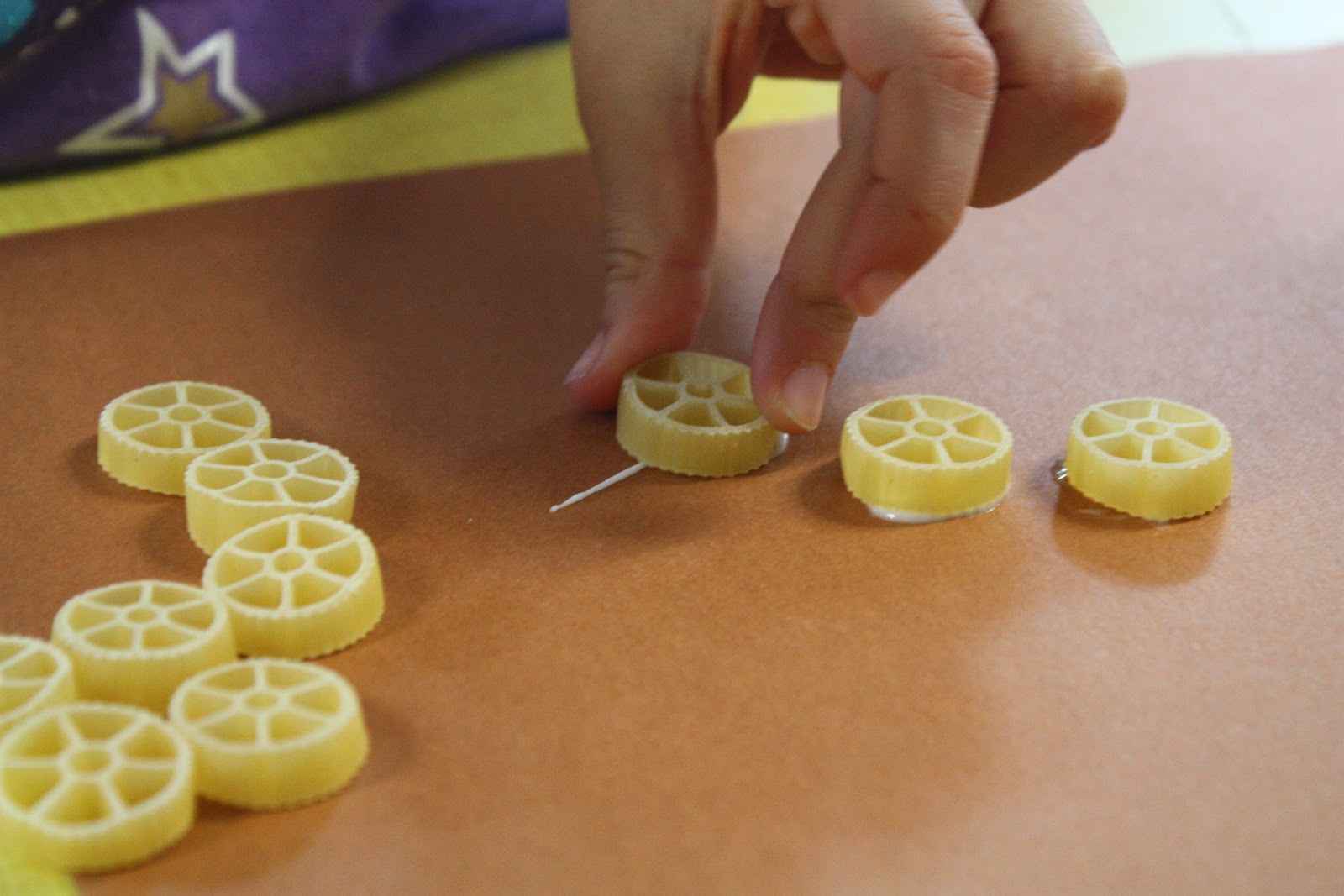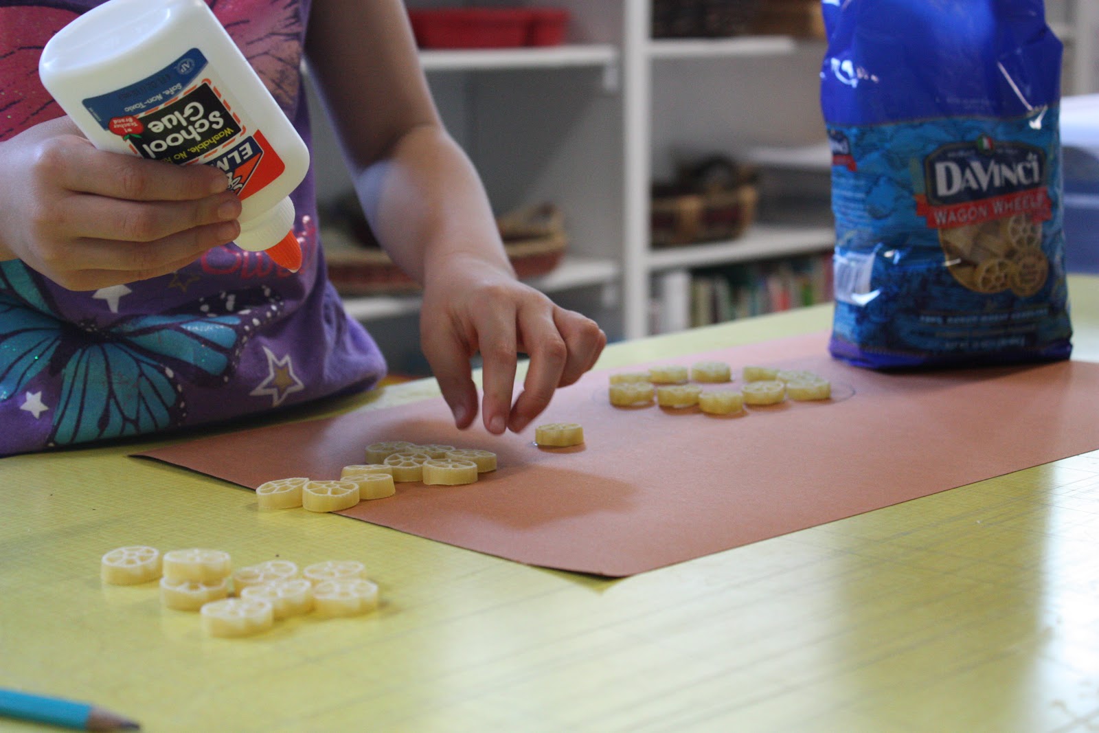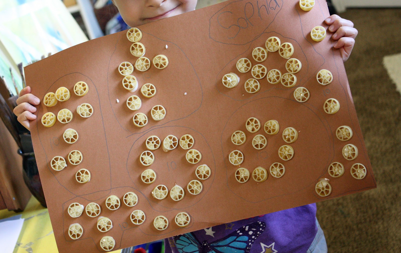 * Give your child a bag of dry pasta, a sheet of sturdy paper, a pencil, and some glue.