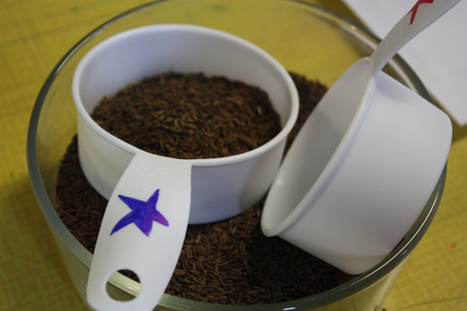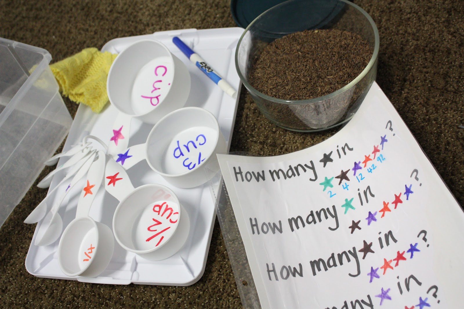 * Buy an inexpensive white or clear set of measuring cups. Using permanent markers of different colors, mark the cups in big, bold letters and numbers.