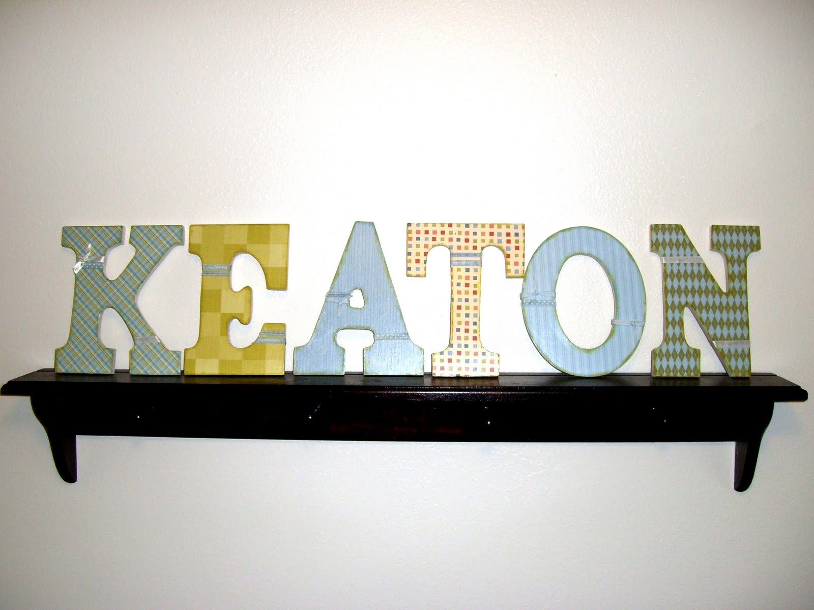 Put a thicker coat of Mod Podge on the top side of the paper and around the edges to get a good seal. Let it dry for another 15 minutes. Then you can add embellishment like ribbon, buttons, flowers, etc. These were just little letters so I didn’t add anything to them.
