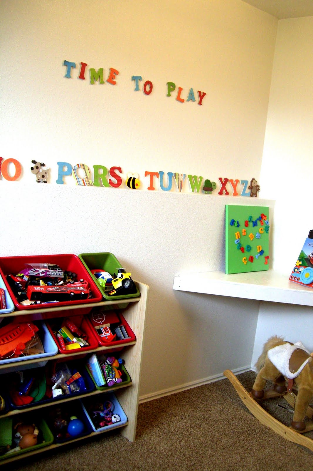 I love the fun colors and the 3D effect the letters give. I also did the same process with the alphabet letters that fit perfectly along this ledge in my little boy’s play room so they match.