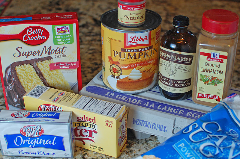 To make this, you will need: 1 18 oz. pkg. yellow cake mix, 4 eggs, 2 sticks of butter, 1 8 oz. package of cream cheese, 1 15 oz. can pumpkin, 1 tsp. vanilla, 16 oz. powdered sugar, 1 tsp. cinnamon, and 1 tsp. nutmeg.