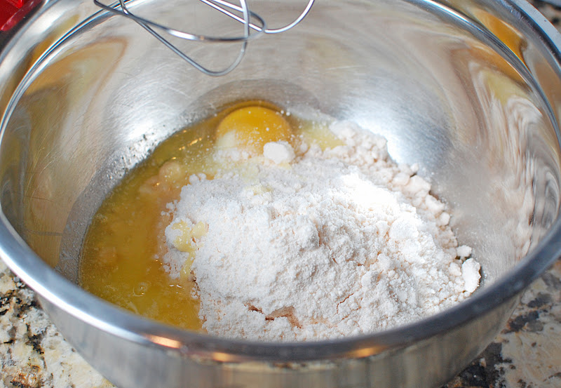 Add the eggs, vanilla, and butter. Beat together.