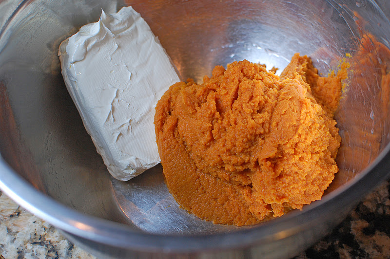 Now, you’re going to make the filling. In a bowl, add the 8oz. pkg of cream cheese and 15 oz. of pumpkin. Beat until smooth.