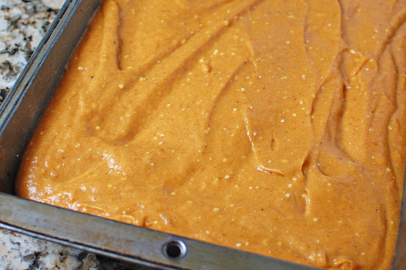 Spread pumpkin mixture over cake batter crust.