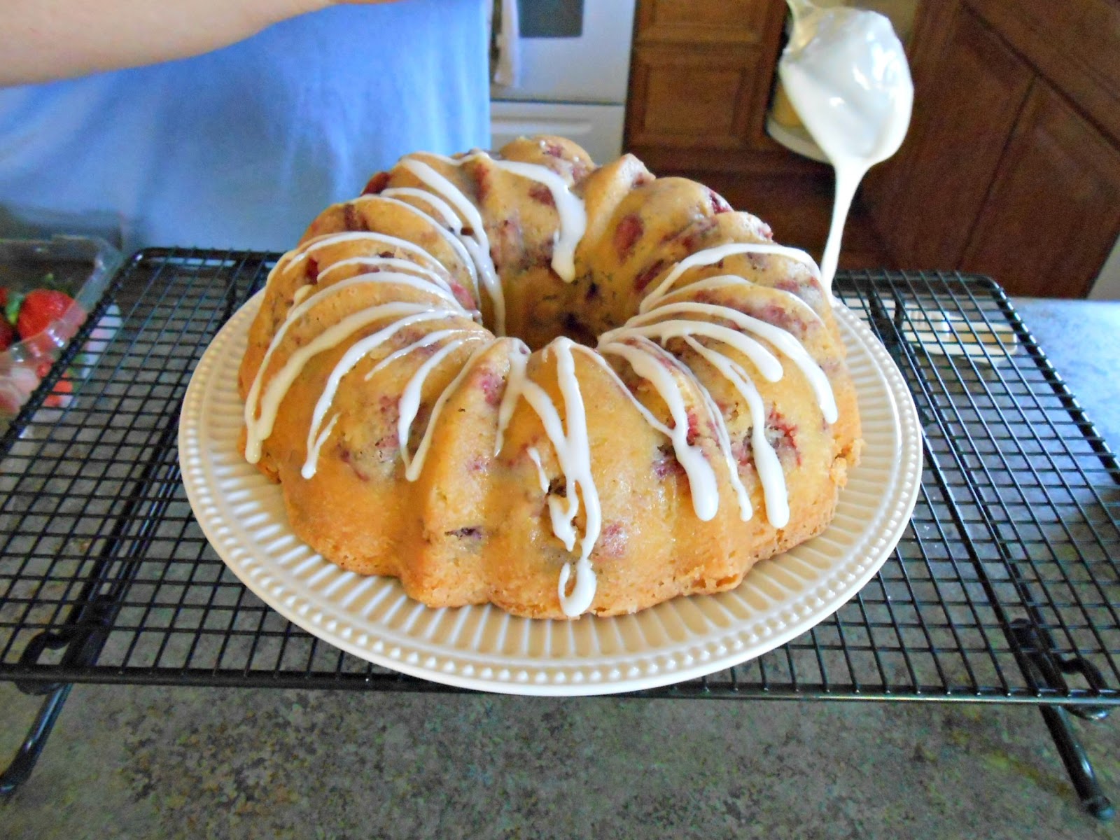 Toss the strawberries with the remaining 1/4 cup of flour. This helps prevent the strawberries from all sinking to the bottom of the pan while baking! Gently fold the strawberries into the batter. Pour batter into your greased bundt pan.