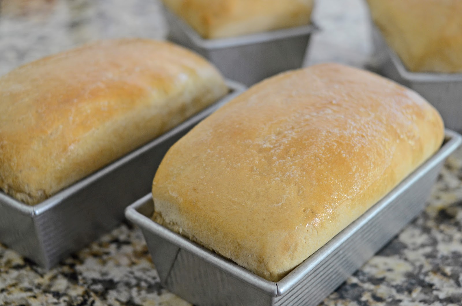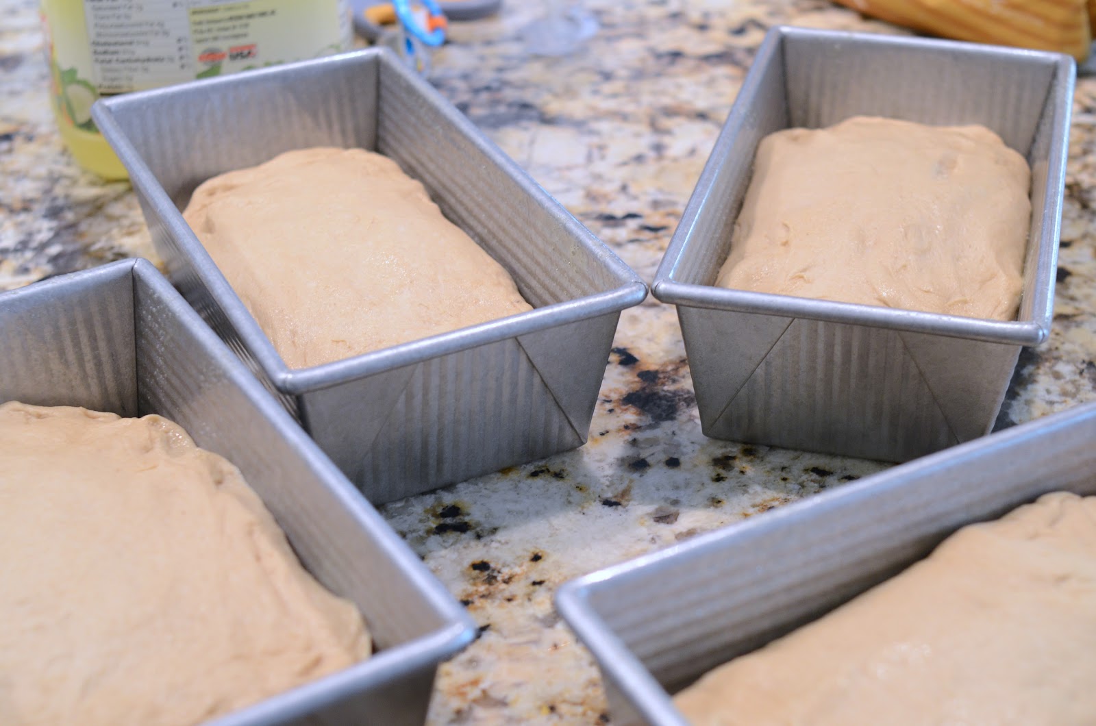 Set your loafs into the warm/moist oven and let it rise for about 15 minutes, or until the dough reaches the tops of the pan. Once it gets to that point, leave them in the oven and turn it on to 350.
