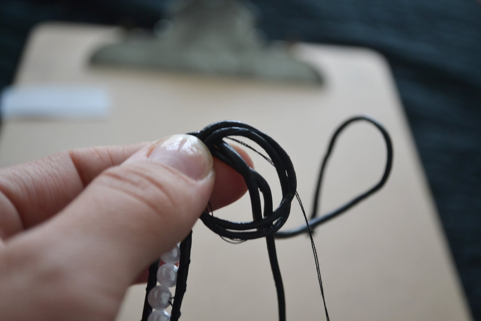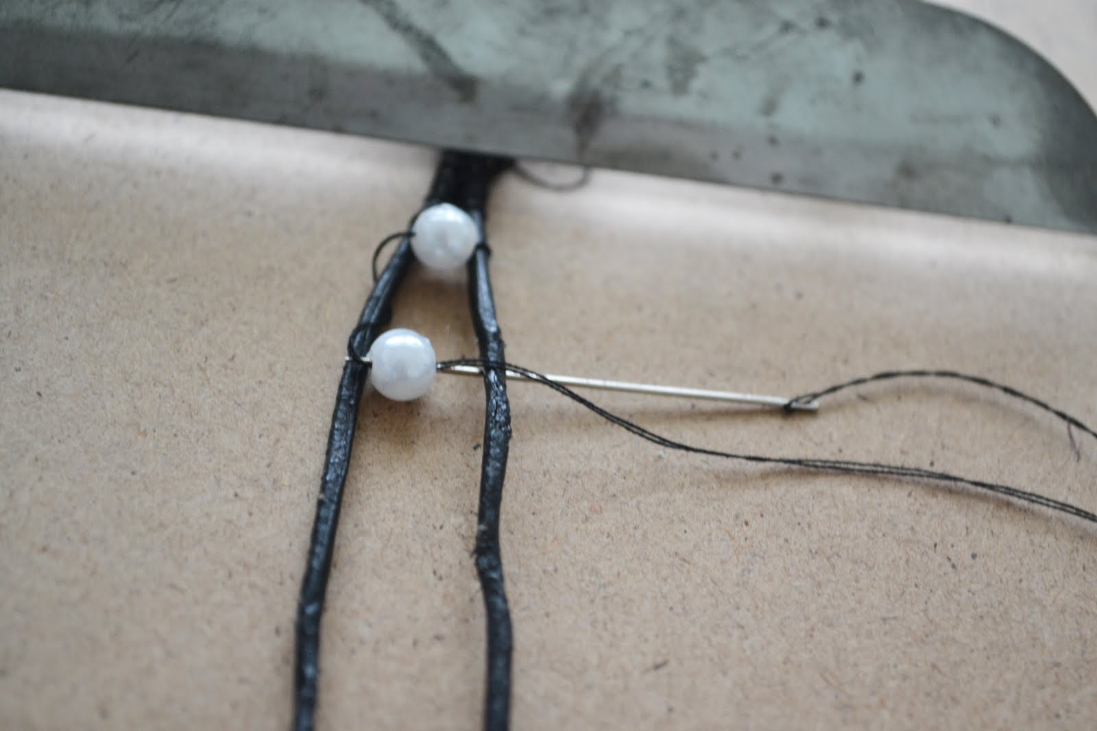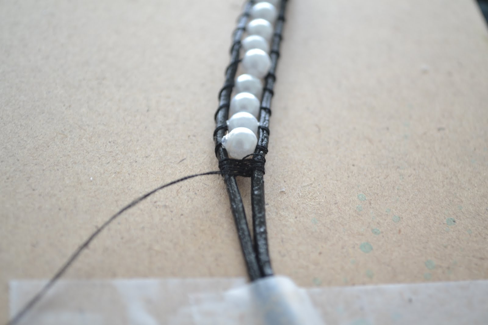 - Start by weaving the needle/thread OVER the right strand of leather, then UNDER the right strand, then OVER the left strand, and back UNDER the left strand. It is a basic figure 8. Don’t use any beads and just do that pattern for a good 7-10 times. Make sure the thread is nice and tight to secure the ends of the beads.