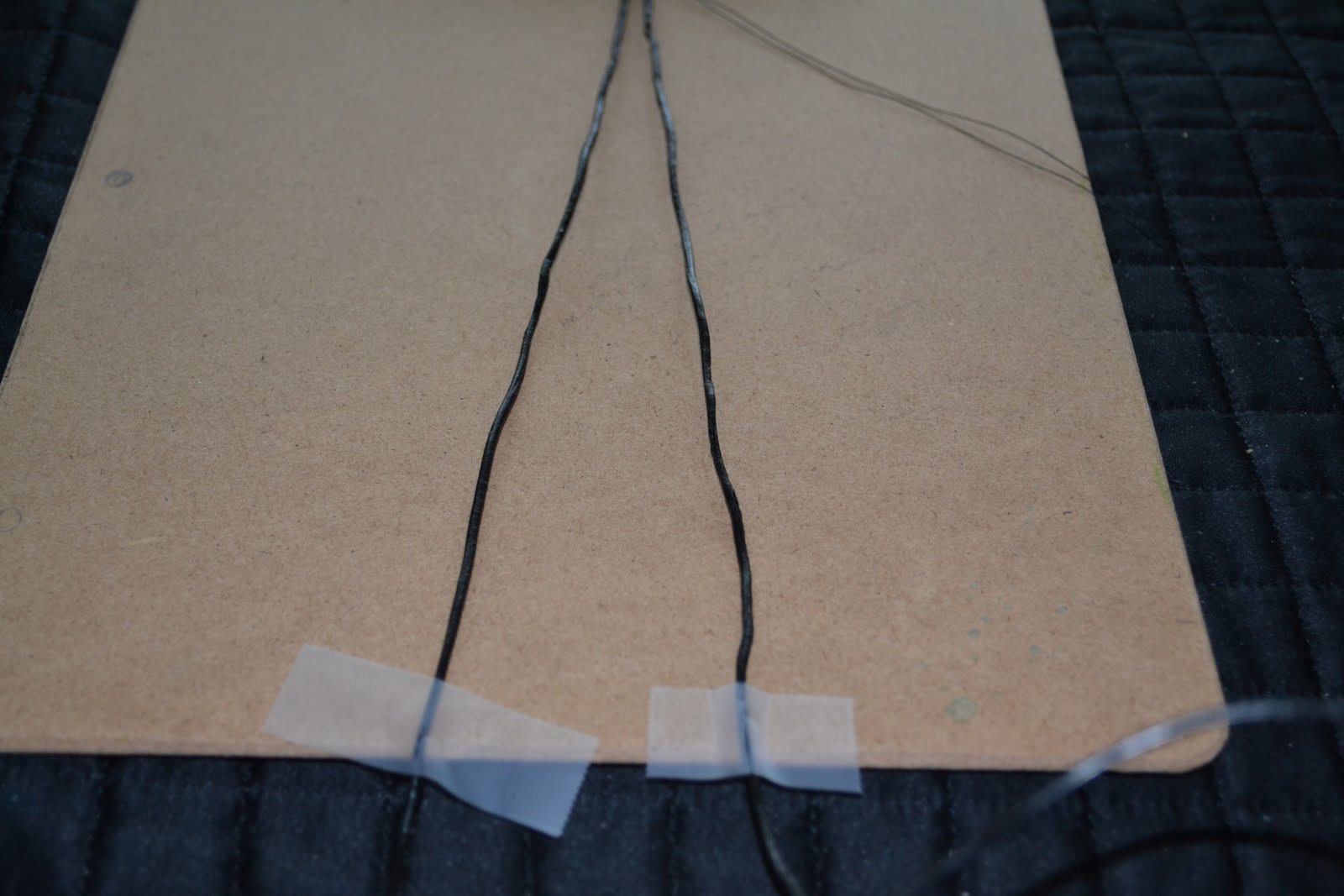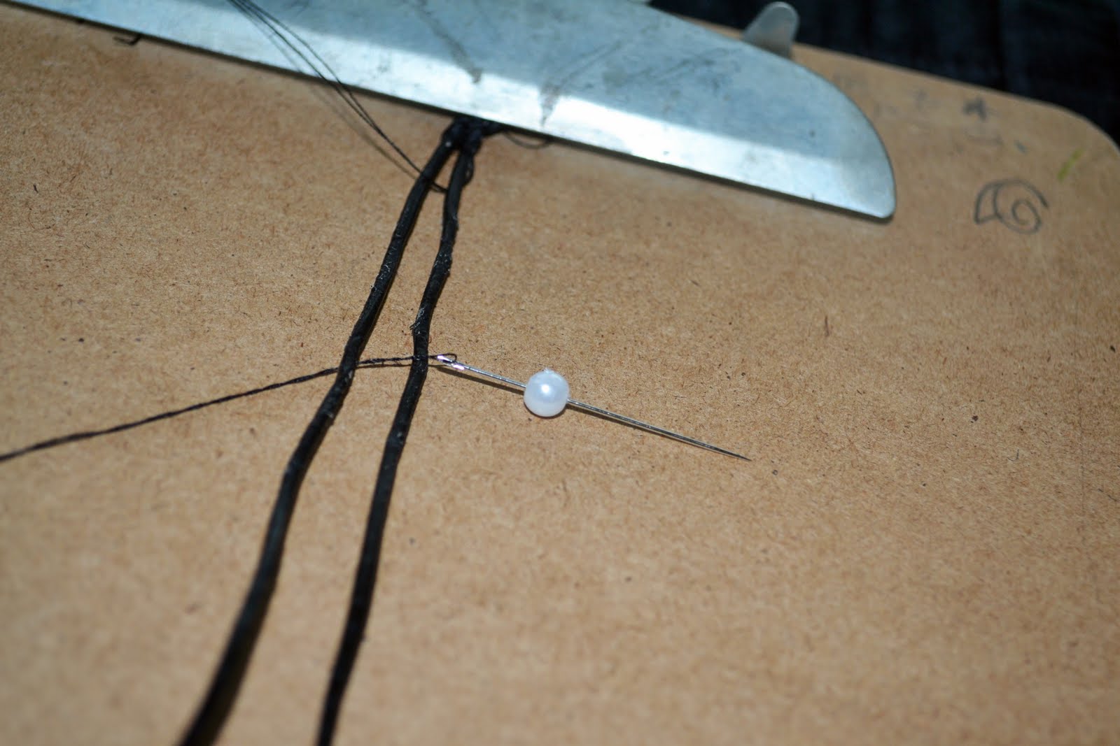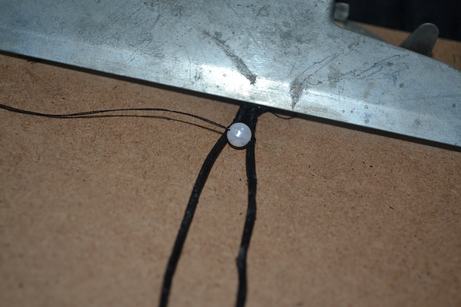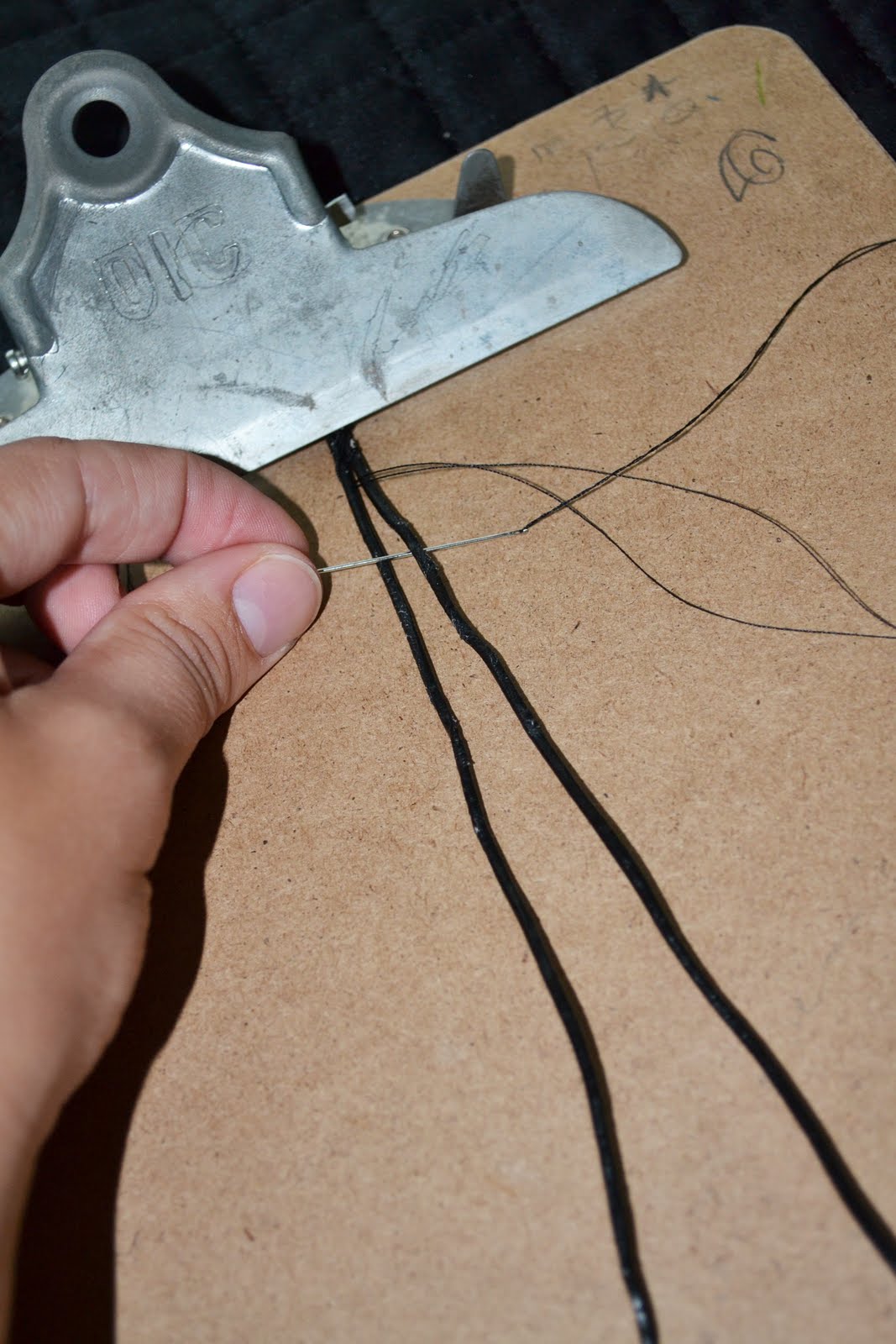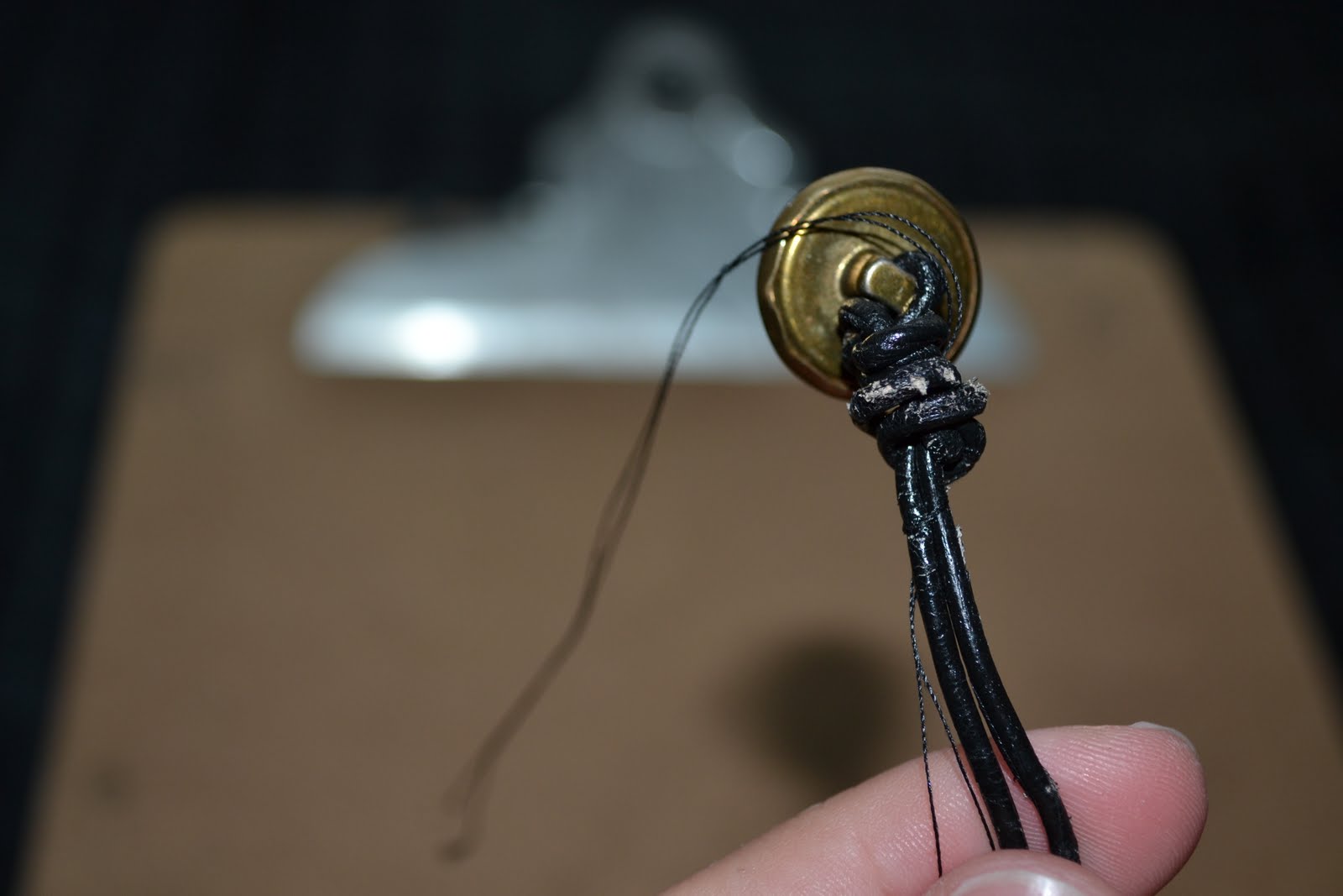 - Put the knot under the clip on the clipboard and separate the three strands (2 leather, 1 thread)