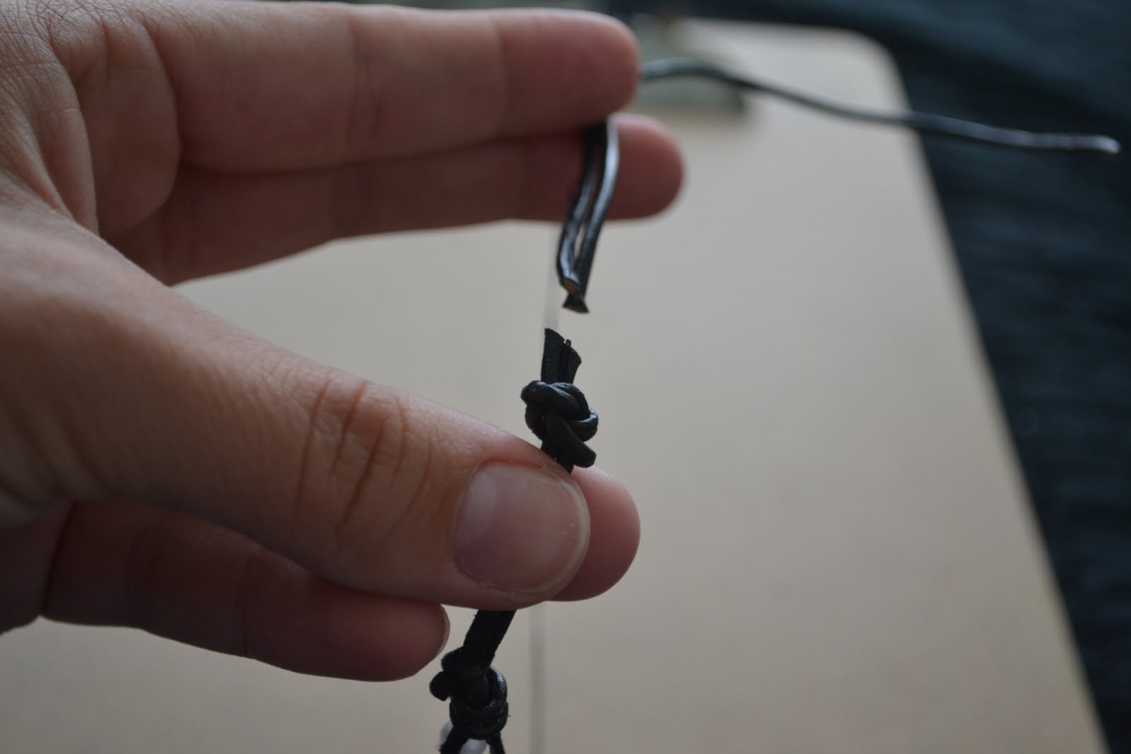 - Add the knotted end of the thread with the leather and tie a knot with all three strands.