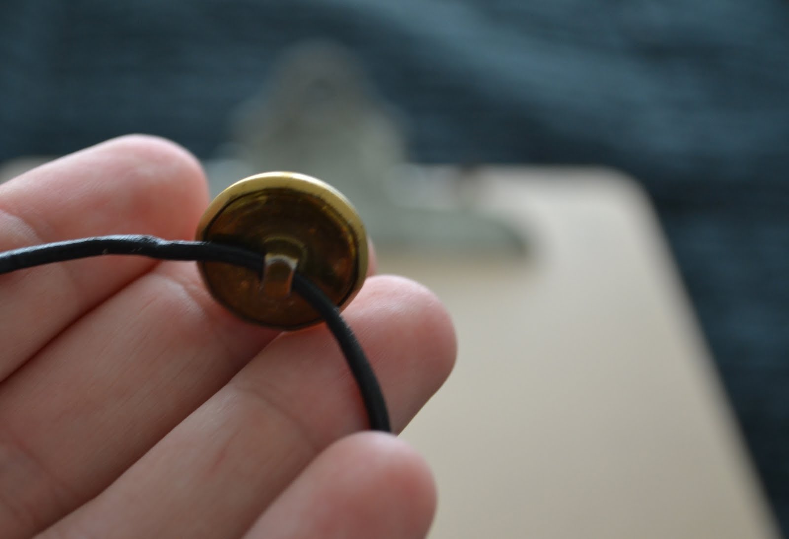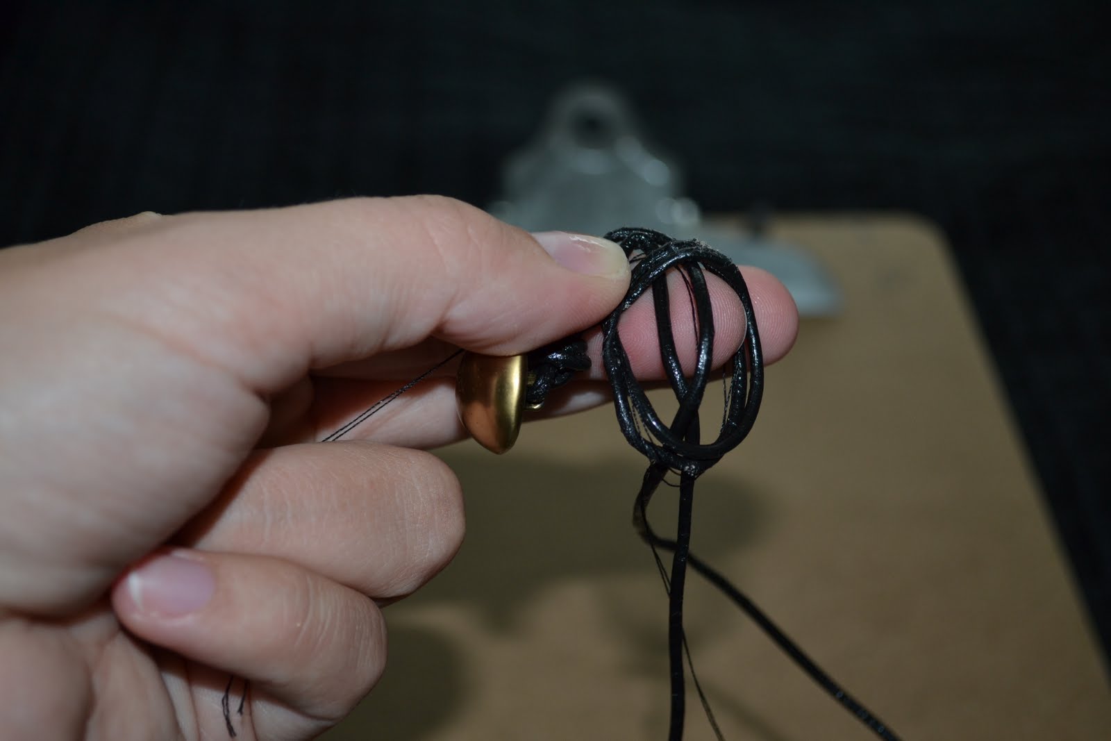- Thread leather through button and line up ends so that they are even lengths