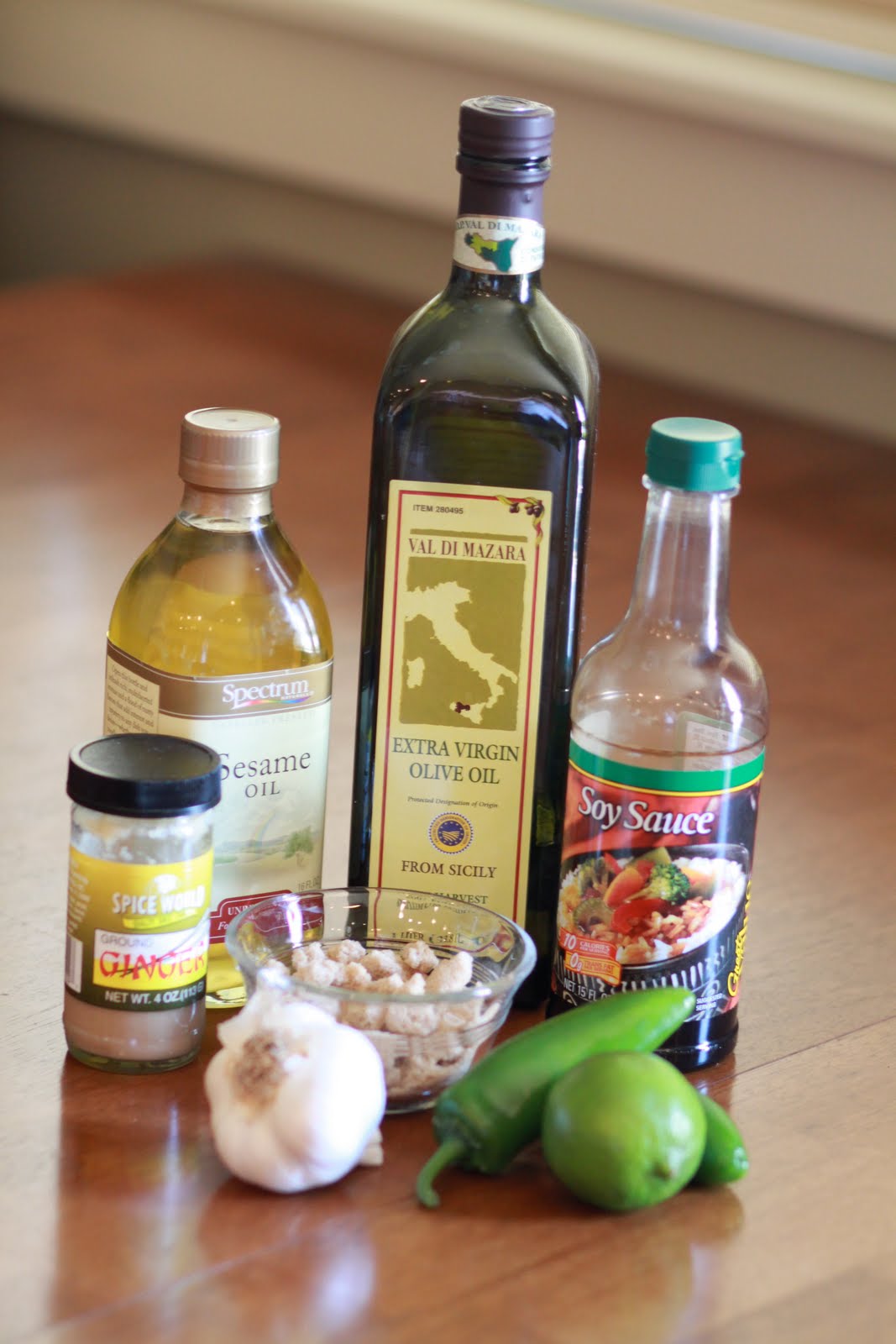 For the dressing you need: Olive oil, sesame oil, soy sauce, cilantro, garlic, fresh ginger, jalepeno, brown sugar and a lime.